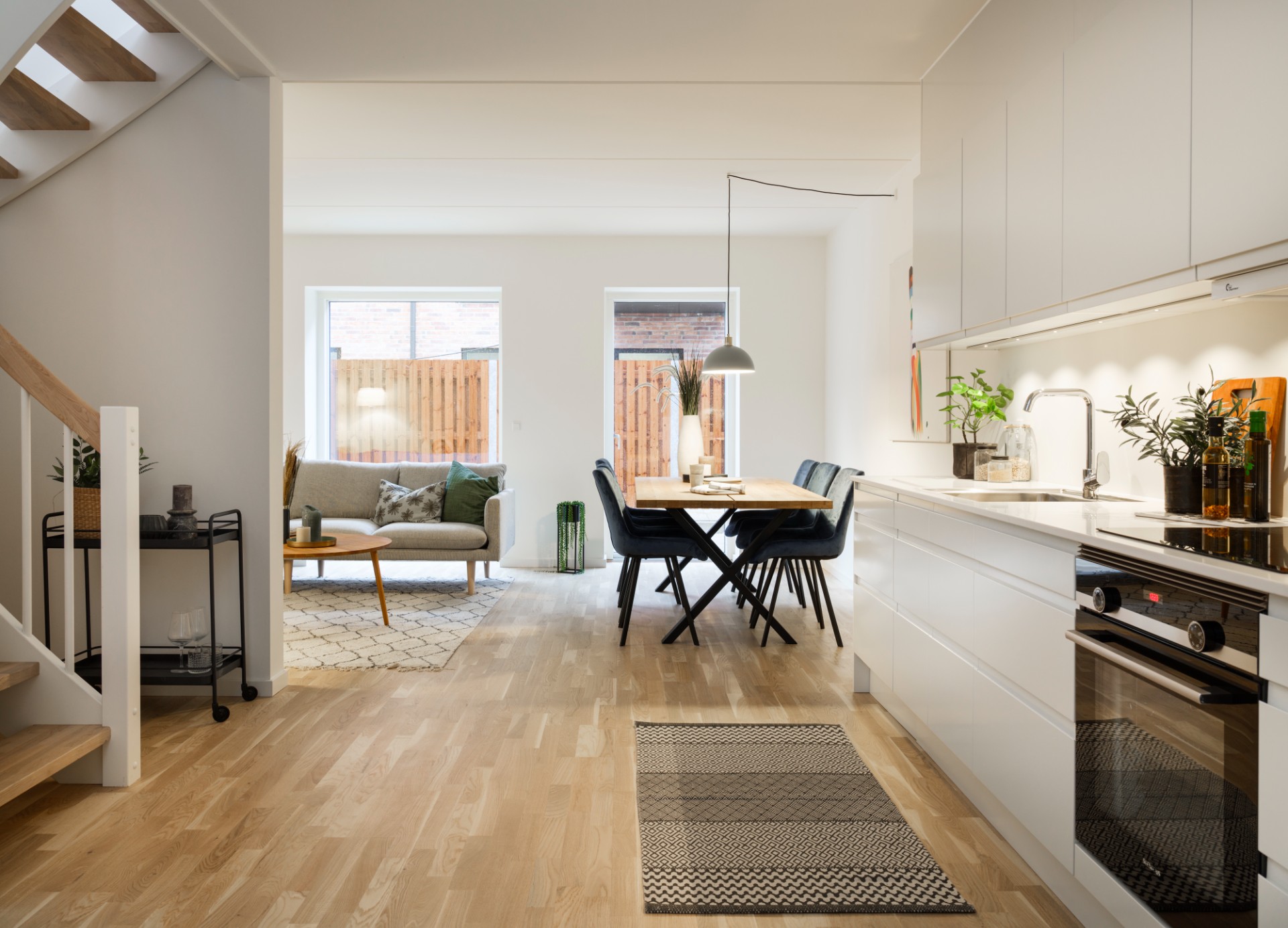 Skønt nyopført 4-værelses rækkehus i 2 plan med egen altan. I stueetagen er badeværelse og et lækkert køkken med direkte forbindelse til stue. På første sal er soveværelse med eget badeværelse samt to gode værelser – det ene med udgang til hyggelig altan. Der er gulvvarme i alle rum, og lyse gulve i egeparket skaber sammen med hvide vægge et roligt udtryk. Køkkenet er fra HTH og udstyret med hårde hvidevarer fra Siemens i energiklasse A+. På badeværelset i stueetagen er vaskesøjle, som også er fra Siemens i energiklasse A+. Rækkehuset har desuden egen terrasse og carport med skur. Lige om hjørnet finder du skønne, grønne områder, hvor du kan nyde naturen.