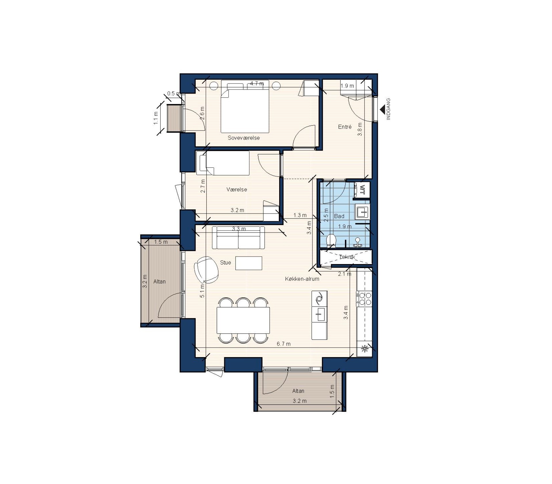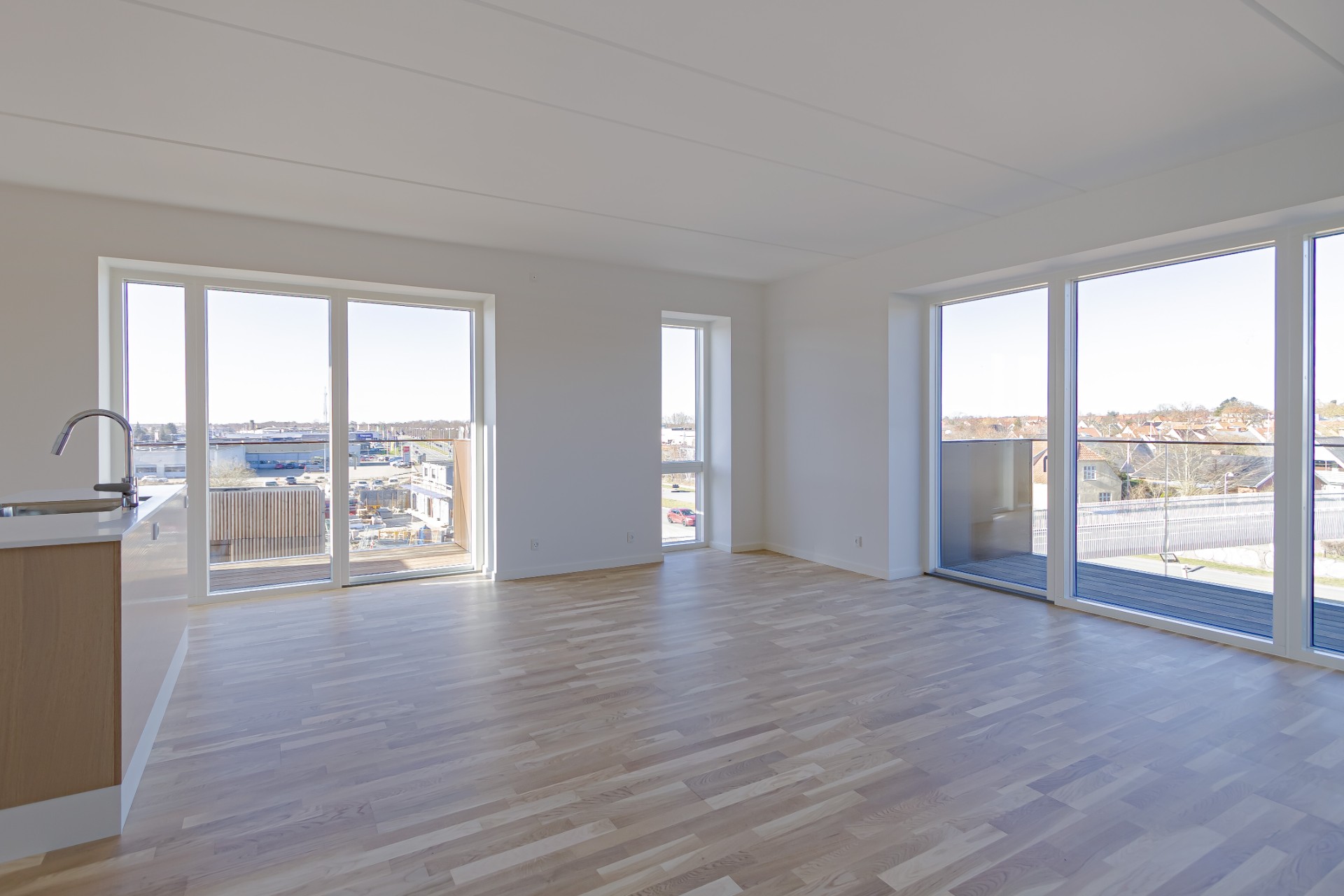 Denne nyopførte 3-værelses lejlighed med gulvvarme i alle rum byder på et attraktivt køkken-alrum med køkkenø med udgang til begge af boligens altaner. Det stilrene Invita-køkken er holdt i lyse farver og fuldt udstyret med hårde hvidevarer, som gør din tid i køkkenet ekstra bekvem. I direkte forlængelse af køkkenet ligger stuen, og derudover har boligen to værelser med fransk altan i soveværelset. I boligen er inkluderet køle/fryseskab, ovn, kogeplade, opvaskemaskine, vaskemaskine og tørretumbler, ligesom der medfølger et depotrum, som ligger i ejendommens kælder.