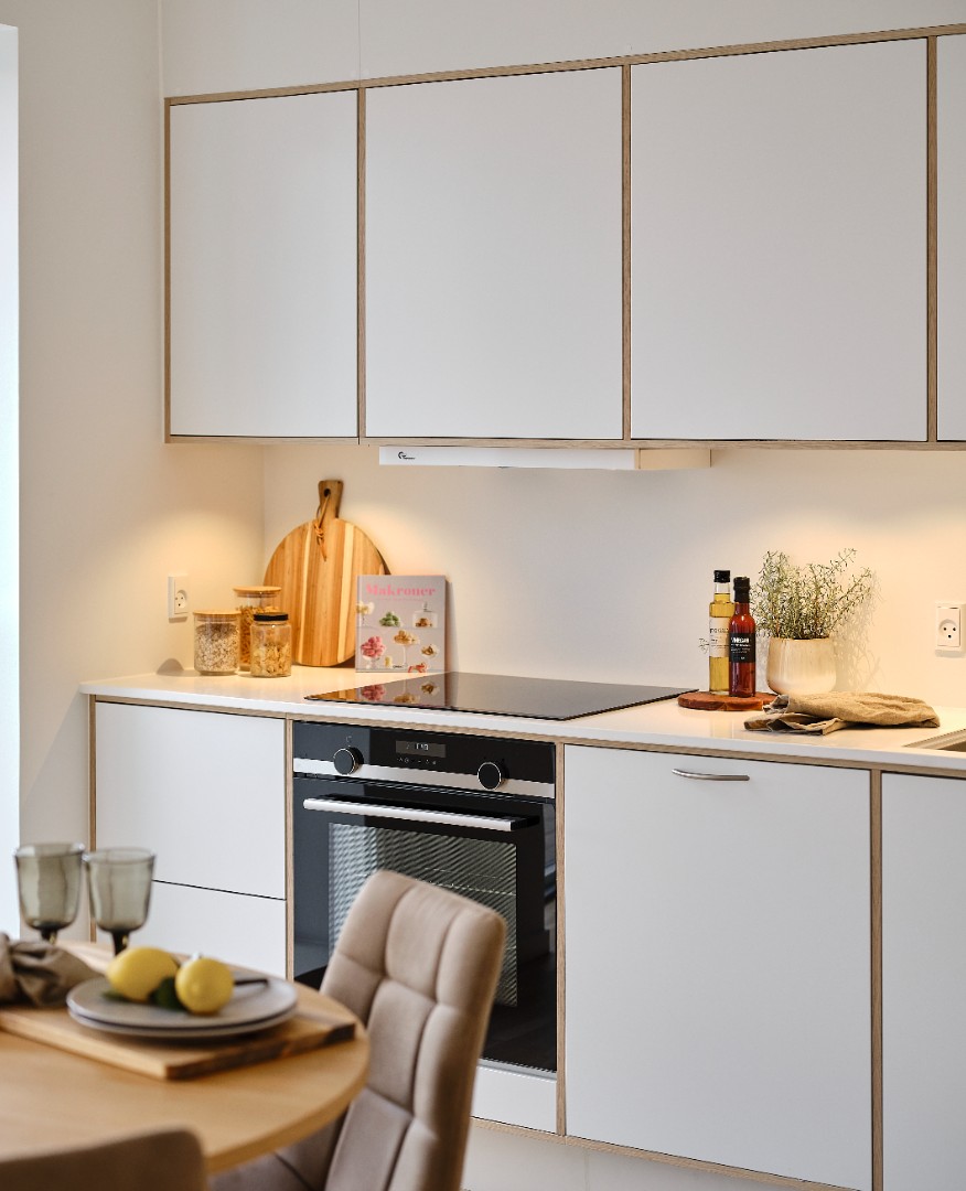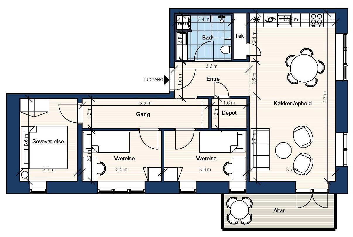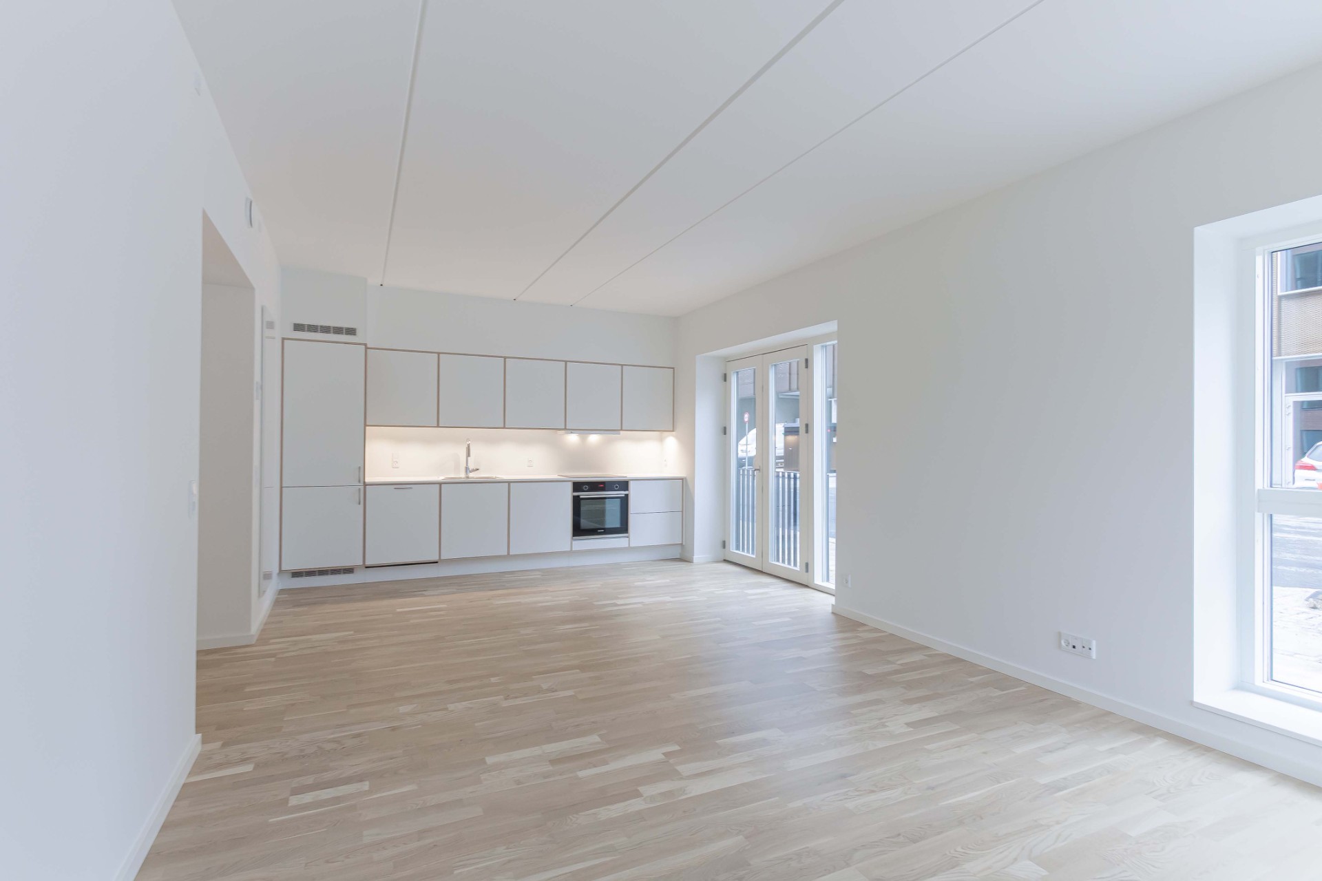 Skøn 4-værelses lejlighed med køkken-alrum, 3 gode værelser og egen altan. Kvalitetskøkkenet er fra Invita og har hårde hvidevarer fra Siemens. På badeværelset er Siemens-vaskesøjle i energiklasse A++, og i soveværelserne er der installeret skabe. Lejligheden har desuden et depotrum. **Bemærk, at billederne og den virtuelle rundvisning er fra en tilsvarende lejlighed af samme type, beliggende i stueetagen. Den ledige lejlighed er beliggende på 1. sal.