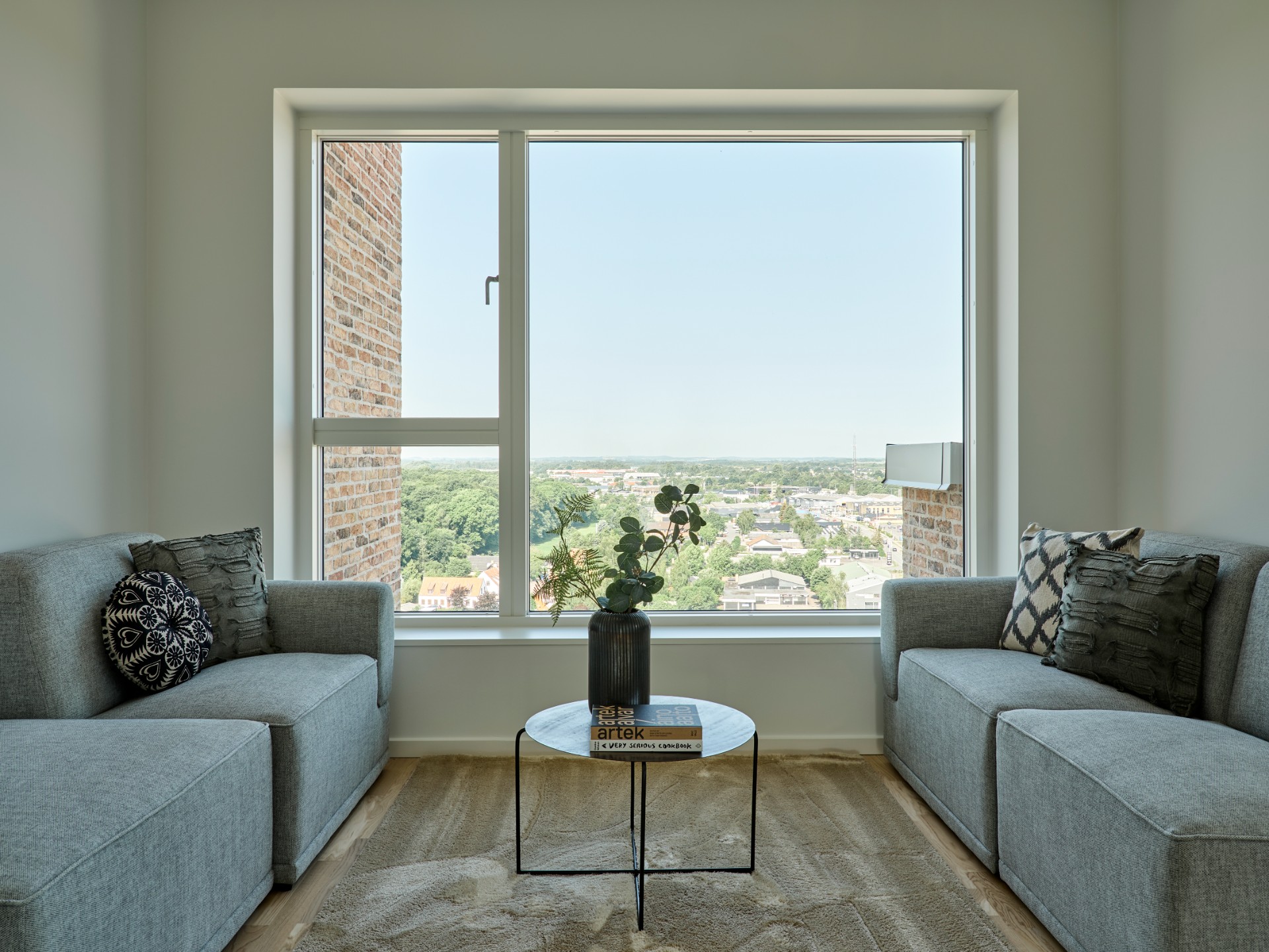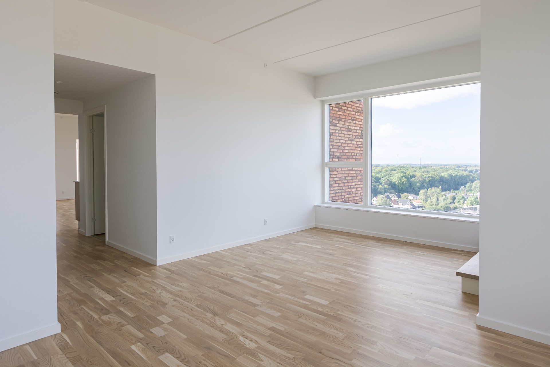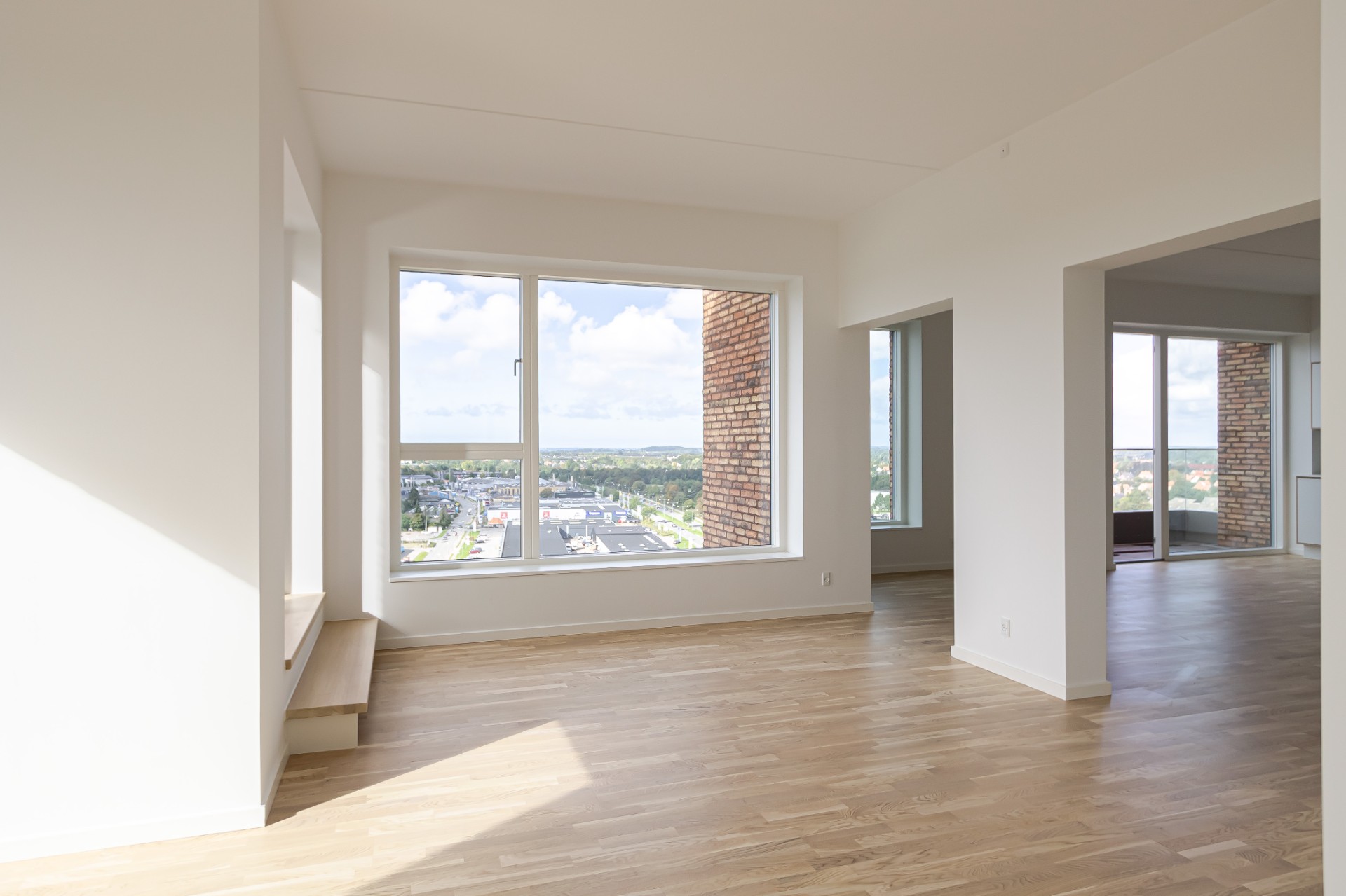 På 14. sal finder du denne indbydende og rummelige 4-værelses penthouselejlighed med god plads og lyse, tidløse materialer. Her bor du med lys og luft omkring dig og med en enestående udsigt over Hillerøds tage og smukke natur. Boligens naturlige samlingspunkt er det store køkken-alrum med et lyst og funktionelt køkken fra Invita. Herfra kan du åbne døren til en vestvendt altan med udsigt over tirsdagsskoven. I forlængelse af køkken-alrummet ligger stuen – et lyst og imødekommende rum med udgang til en skøn, sydvestvendt tagterrasse. I modsatte ende af boligen finder du endnu en stue med en nordvestvendt tagterrasse, hvorfra du kan nyde udsigten til Frederiksborg Slot, mens aftensolen farver himlen over Hillerød. Lejligheden byder derudover på et soveværelse med garderobe, et værelse, to badeværelser og et praktisk depotrum. Der er gulvvarme i alle rum, og boligen er udstyret med hårde hvidevarer fra Siemens, herunder vaskemaskine og tørretumbler.
