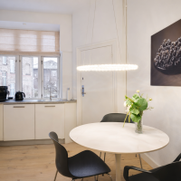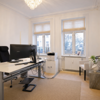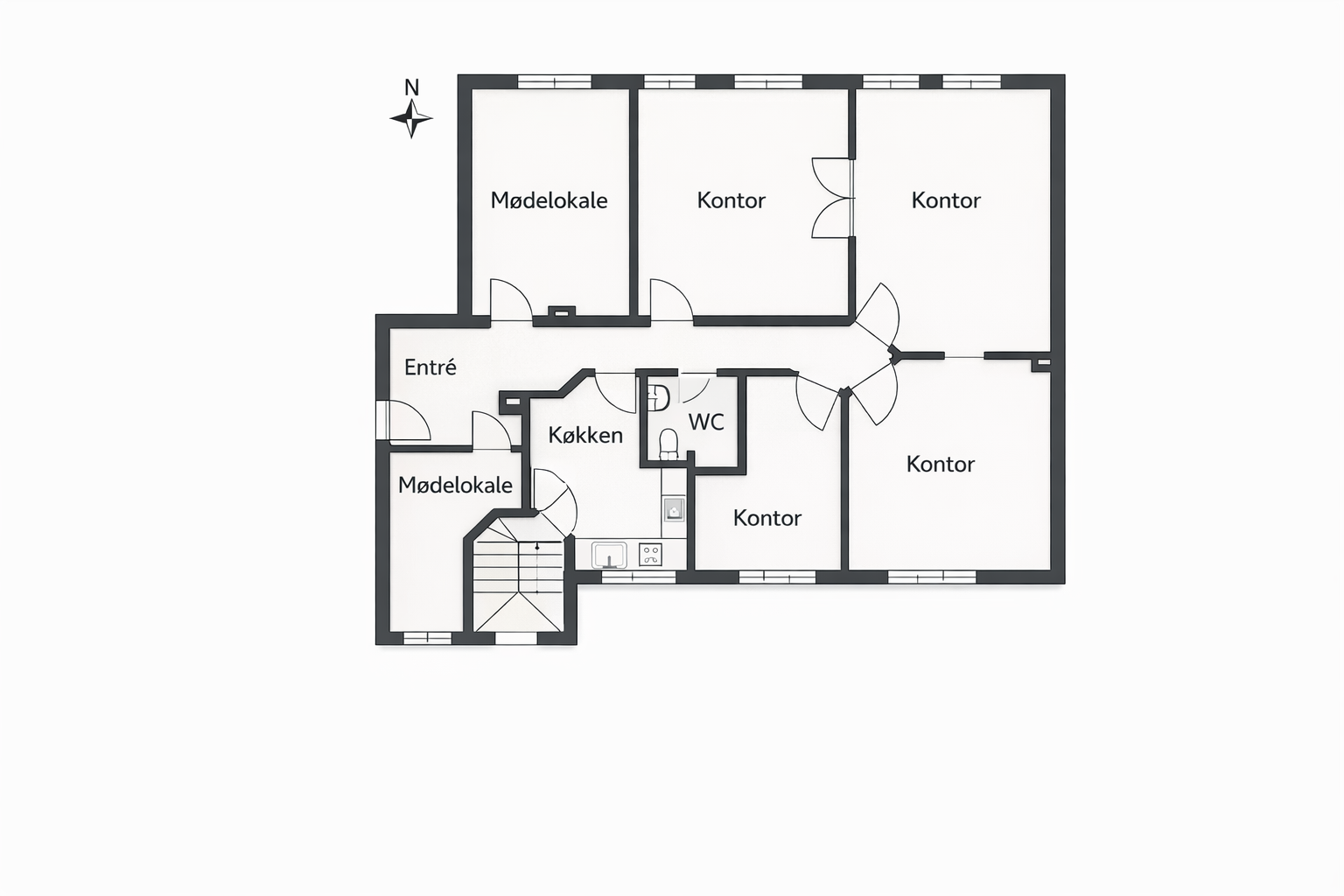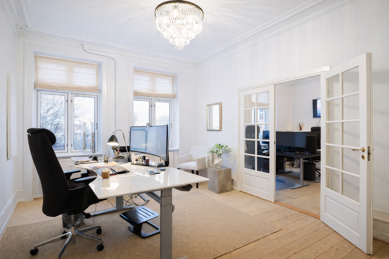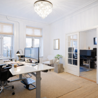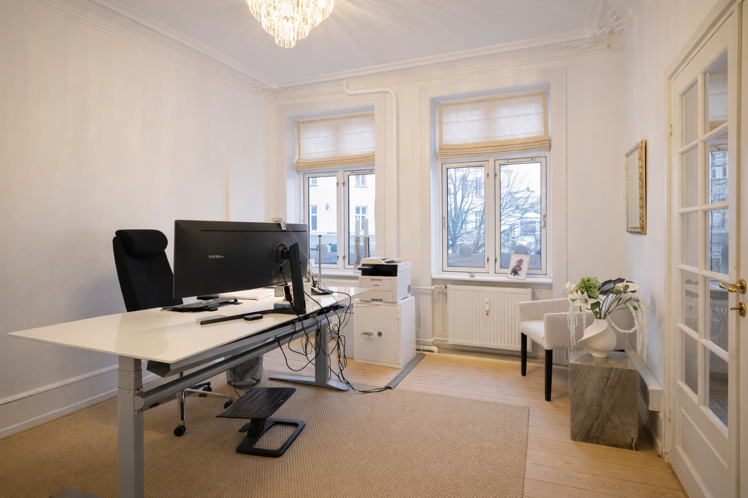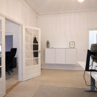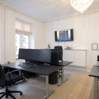 Flot kontor på 153 m² fordelt med 3 store kontorlokaler, ét stort møderum samt 2 mindre møde-/kontorlokaler, tekøkken og toilet. Der er godt lysindfald og højt til loftet, som er med til at skabe et godt og behageligt arbejdsmiljø. Fyldningsdørene og de pæne, ludbehandlede plankegulv giver lejemålet et eksklusivt udtryk.