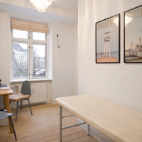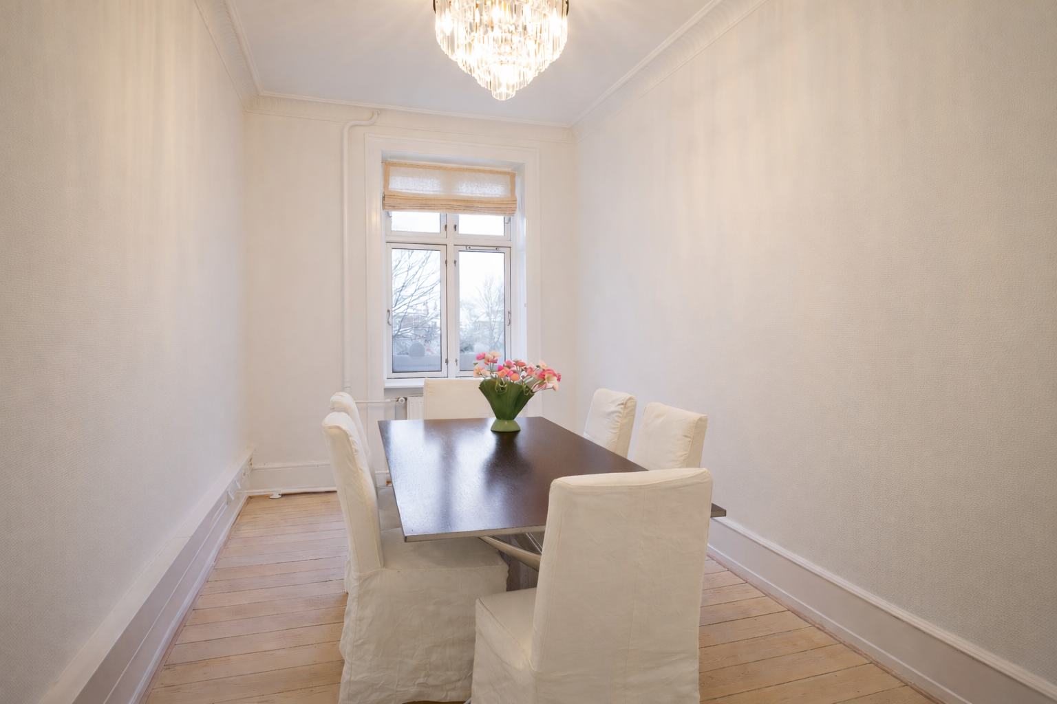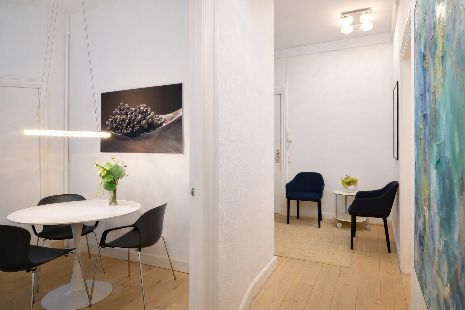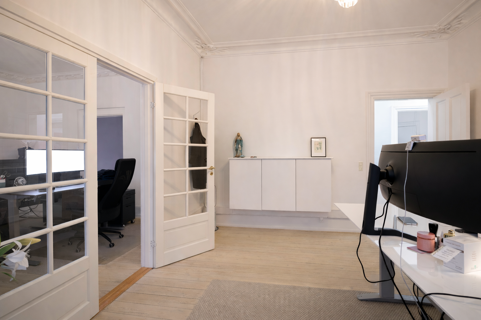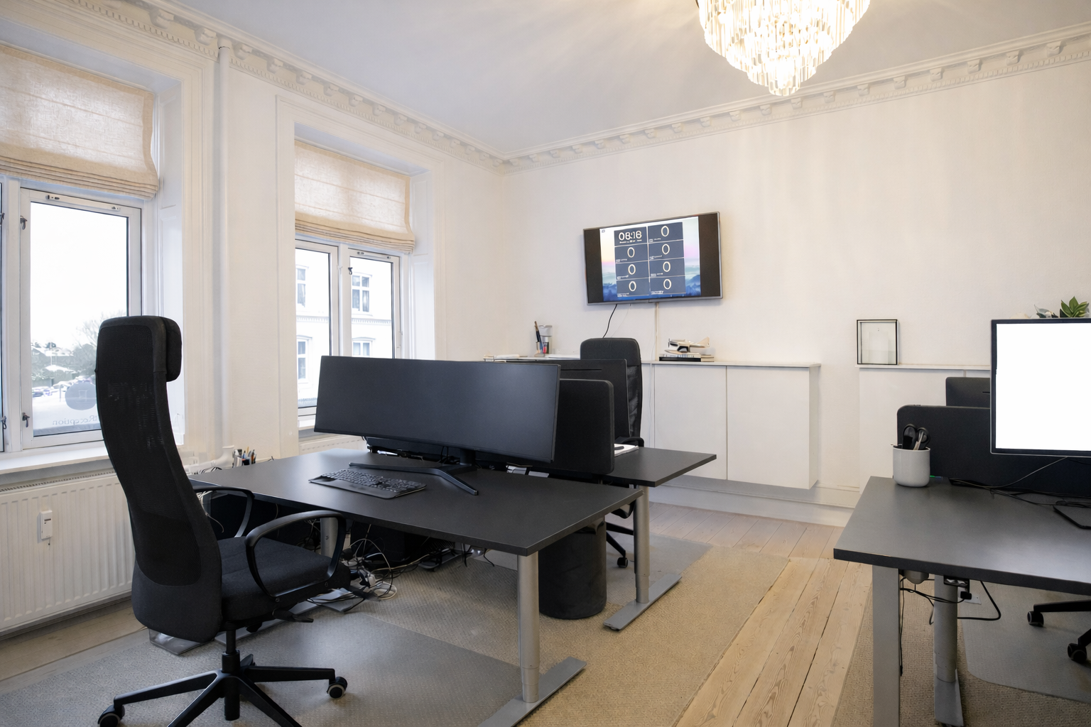 Flot kontor på 153 m² fordelt med 3 store kontorlokaler, ét stort møderum samt 2 mindre møde-/kontorlokaler, tekøkken og toilet. Der er godt lysindfald og højt til loftet, som er med til at skabe et godt og behageligt arbejdsmiljø. Fyldningsdørene og de pæne, ludbehandlede plankegulv giver lejemålet et eksklusivt udtryk.