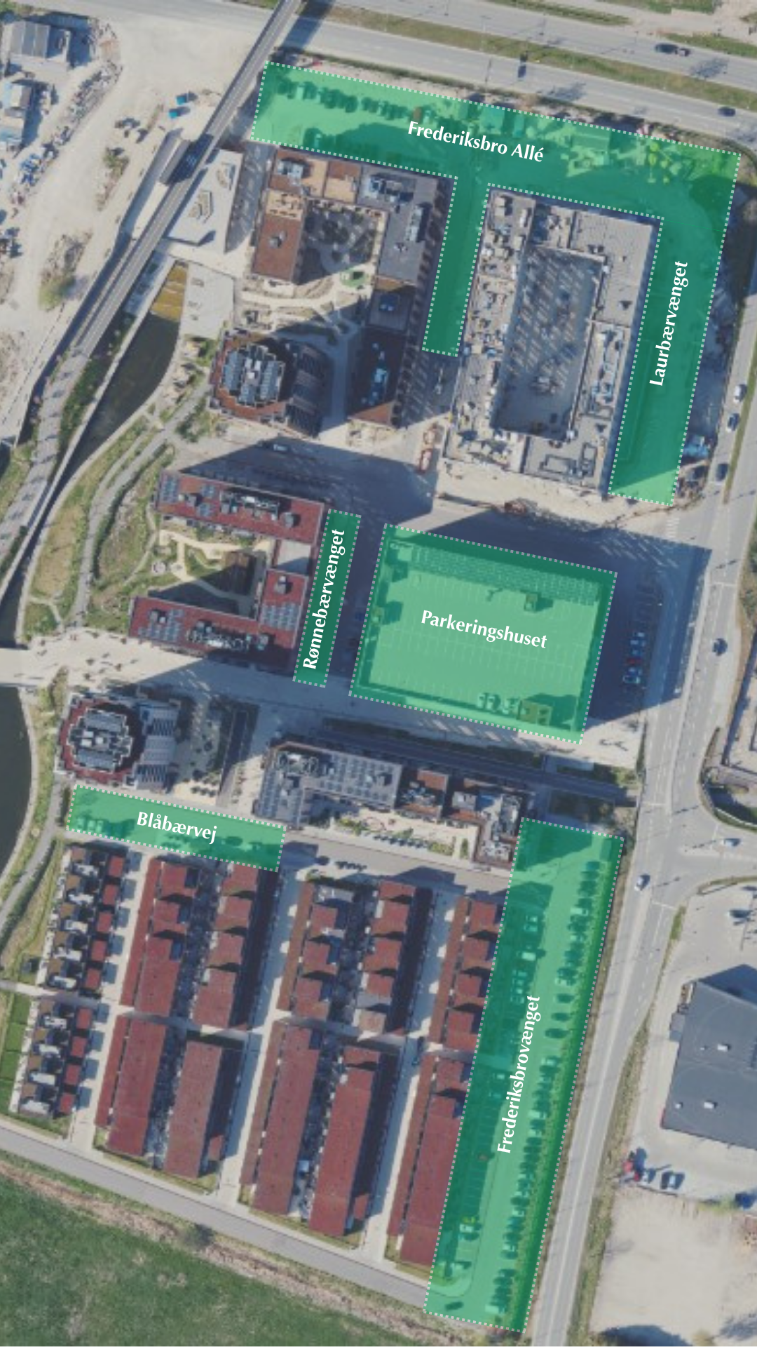 Med en beboerlicens til området kan du benytte ladestanderne på Frederiksbrovænget og Frederiksbro Allé. I første kvartal af 2026 etableres desuden 12 nye ladestandere på 2. sal i parkeringshuset, som kan benyttes af alle med beboerlicens til området.